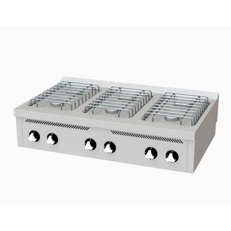 Fourneau à gaz professionnel, 6 feux, permet de réaliser plusieurs préparations simultanément, idéal pour les professionnels de la restauration.