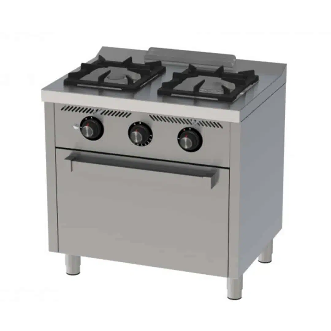 Fourneau à gaz avec four à gaz GN 1/1, 2 feux, permet de réaliser plusieurs préparations simultanément, idéal pour les professionnels de la restauration.