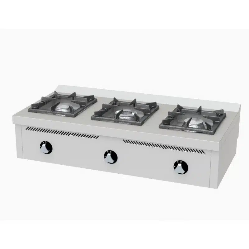 Fourneau à gaz professionnel, 3 feux, permet de réaliser plusieurs préparations simultanément, idéal pour les professionnels de la restauration.