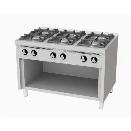 Fourneau à gaz professionnel, 6 feux, permet de réaliser plusieurs préparations simultanément, idéal pour les professionnels de la restauration.
