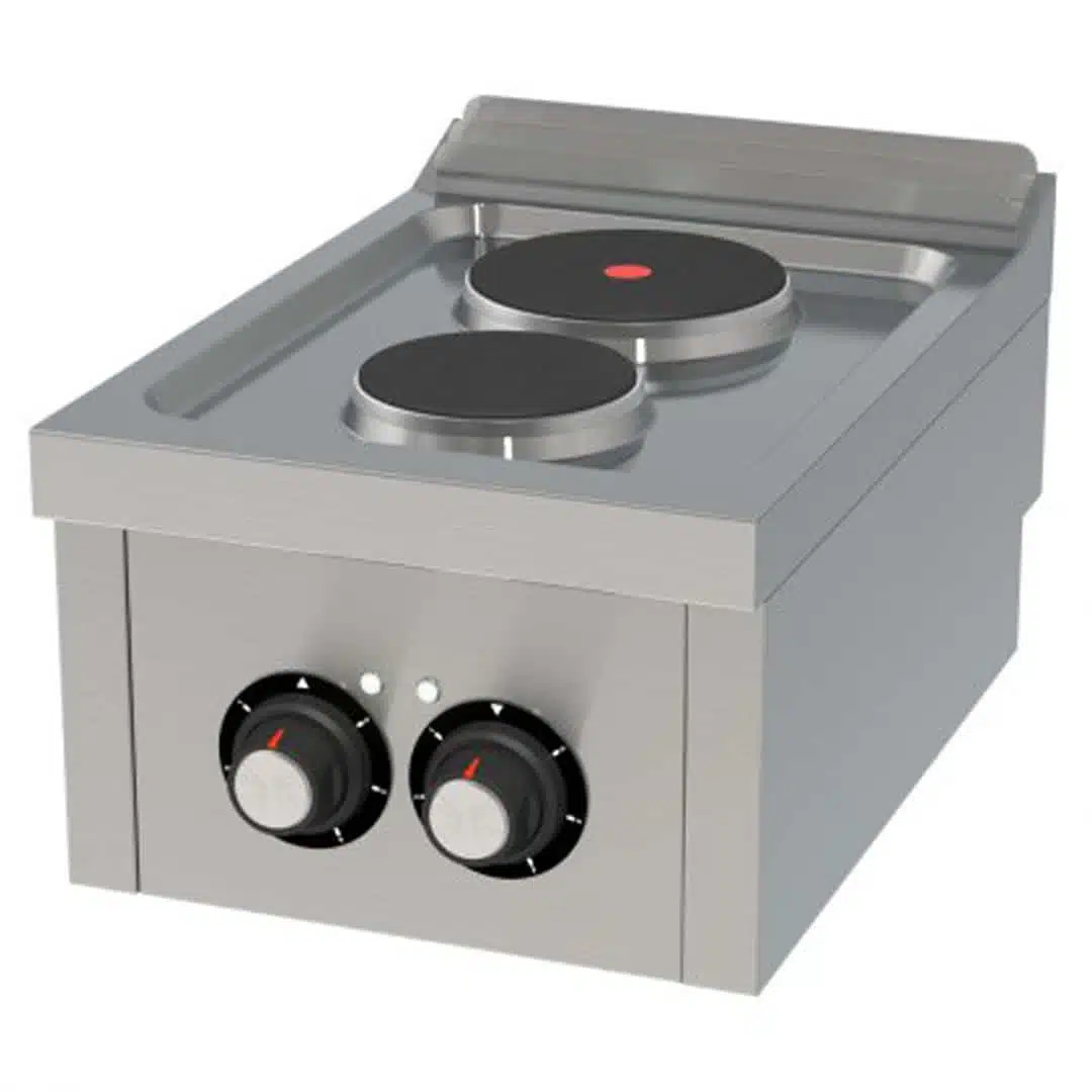 Fourneau électrique professionnel, 2 plaques, permet la préparation rapide des ingrédients, idéal pour les professionnels de la restauration.