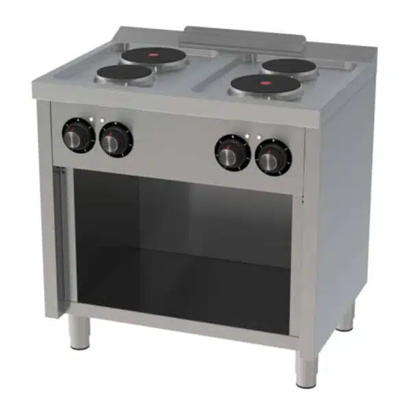 Fourneau électrique sur placard, 4 plaques, permet la préparation rapide des ingrédients, idéal pour les professionnels de la restauration.