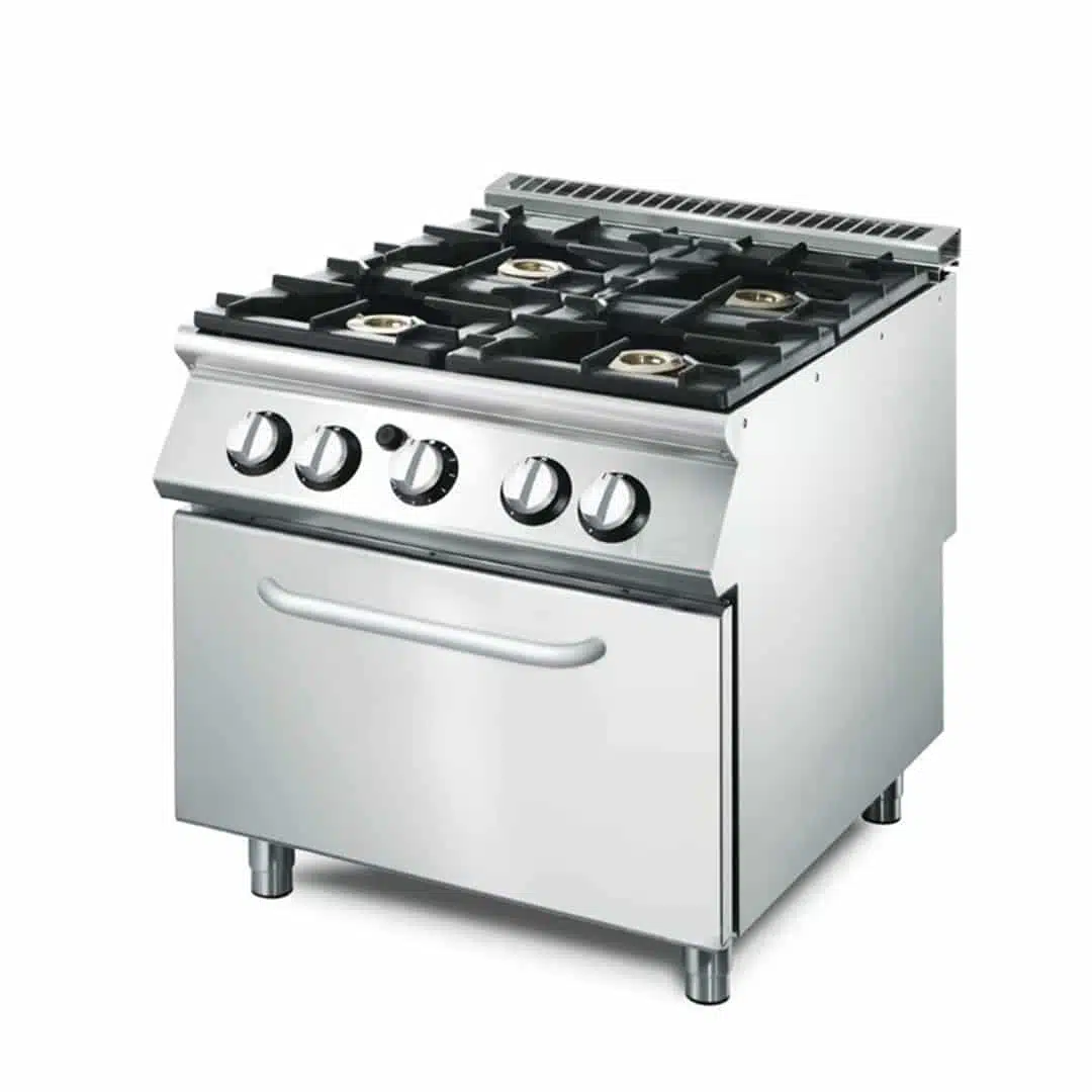 Fourneau gaz 4 feux sur four, performant, associe robustesse, praticité et efficacité, tout en s’intégrant facilement dans votre cuisine professionnelle.