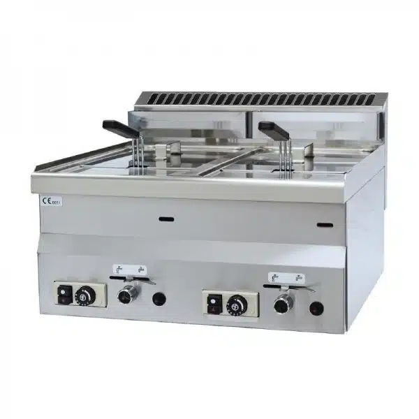 Friteuse à poser inox 2 x 8 L, robuste et fiable grâce à sa structure en acier anoxydable, allumage piezo, valve de sécurité thermostatique et coupe-circuit thermique, pratique et efficace pour vos préparations.