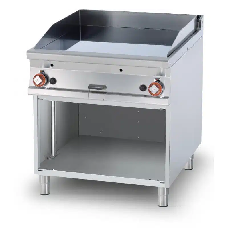 Fry top gaz plaque acier 1/2 lisse 1/2 rainurée chrome 18 kW sur meuble ouvert