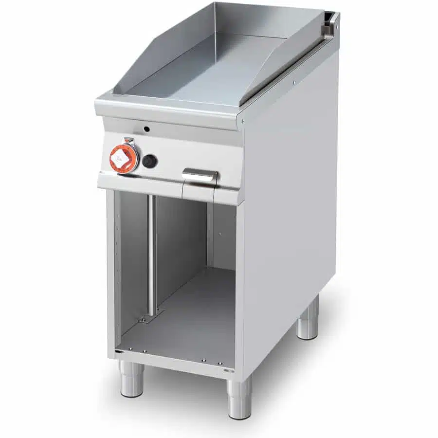 Fry top gaz plaque acier lisse 9 kW sur meuble ouvert
