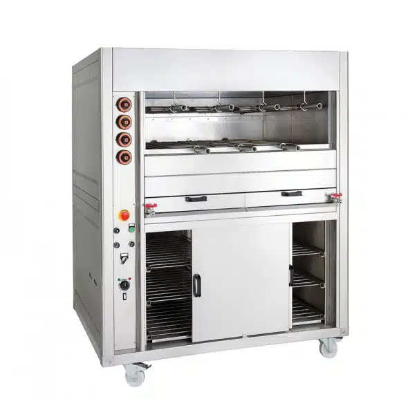 Grill à gaz rotatif multifonctions avec armoire chaude, economique et performant, parfait griller tout type d’aliments simultanément.