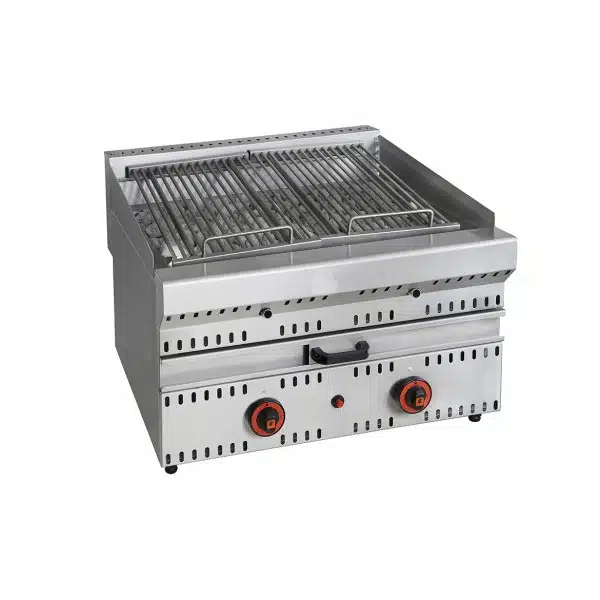 Grill professionnel en pierre de lave à gaz, avec une structure résistante en acier inoxydable, pratique pour tout type de viande et poisson.