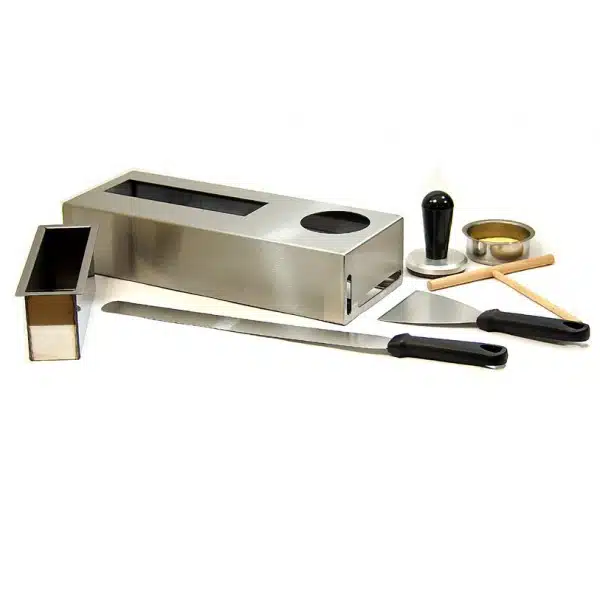 1 Boitier inox, 2 spatules, 1 râteau, 1 tampon graisseur