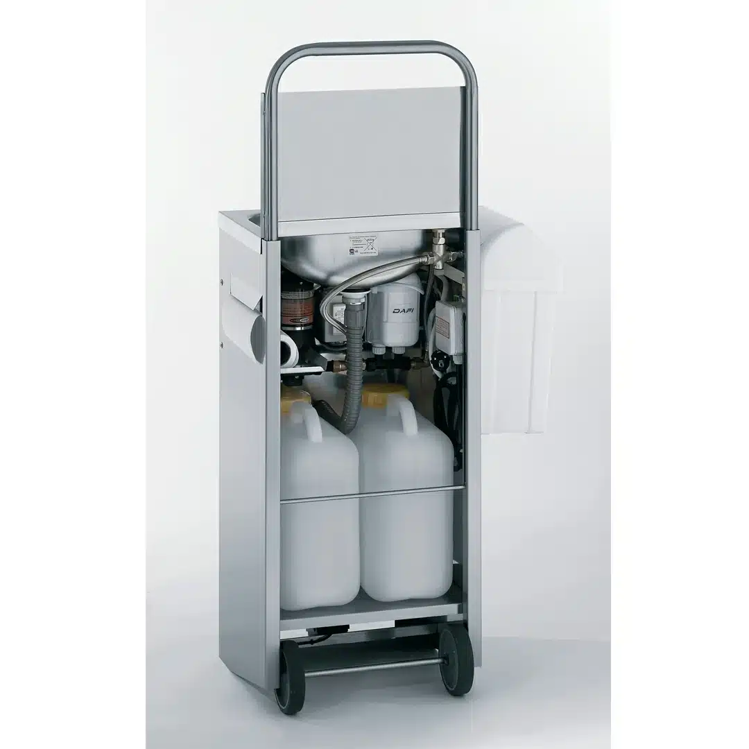 Lave-mains autonome chauffant : comporte un chauffe-eau électrique intégré, pour une production d’eau chaude instantanée. Une molette permet de régler la température de l’eau (jusqu’à 45°C). Livré avec cordon de branchement et prise électrique, raccordement 230 V, 16 ampères. Puissance 3,7 kW. Protection du chauffe-eau en cas d’absence d’eau dans le bidon.
