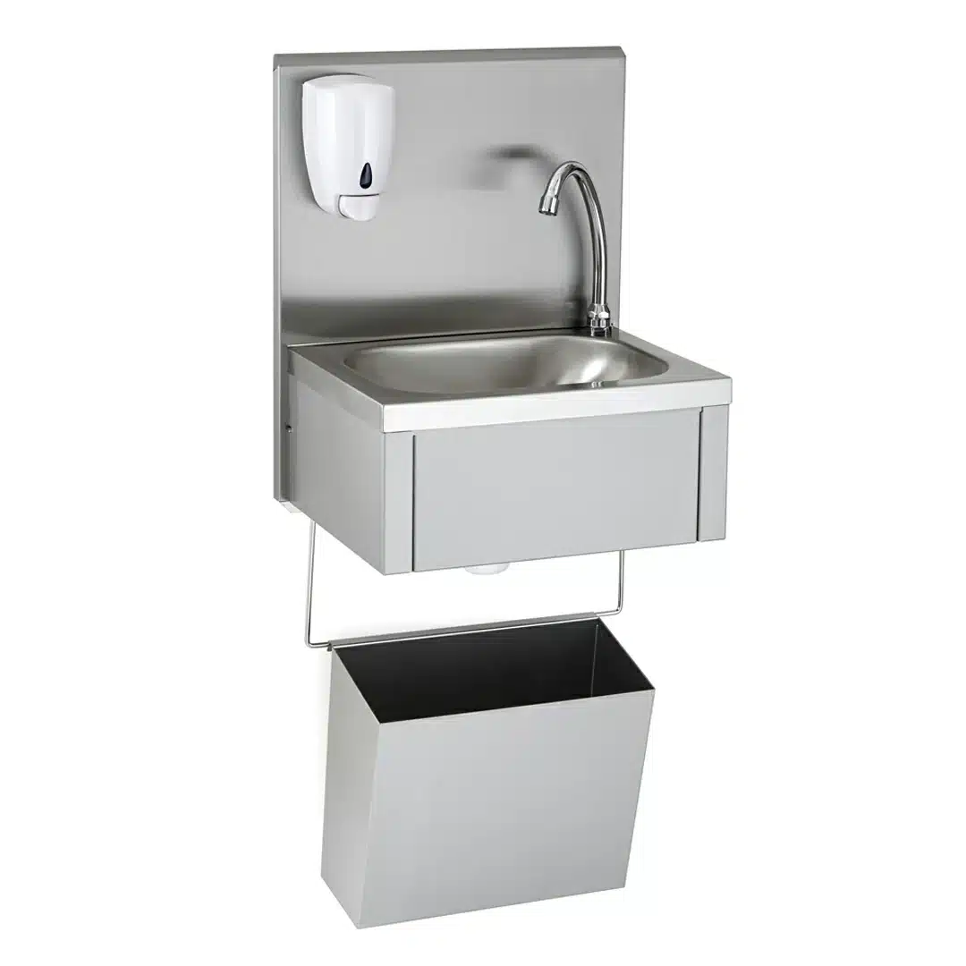Lave-mains GC avec dosseret + distributeur de savon + corbeille inox, pratique pour le respect de l’hygiène dans une cuisine professionnelle.