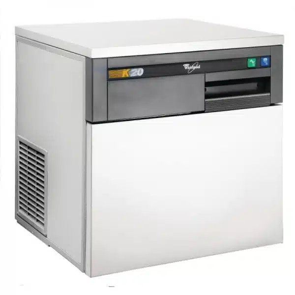 Machine à glaçons compacte Whirlpool,capable de produire 20 kg de glaçons en 24 heures avec une capacité de stockage de 10 kg.