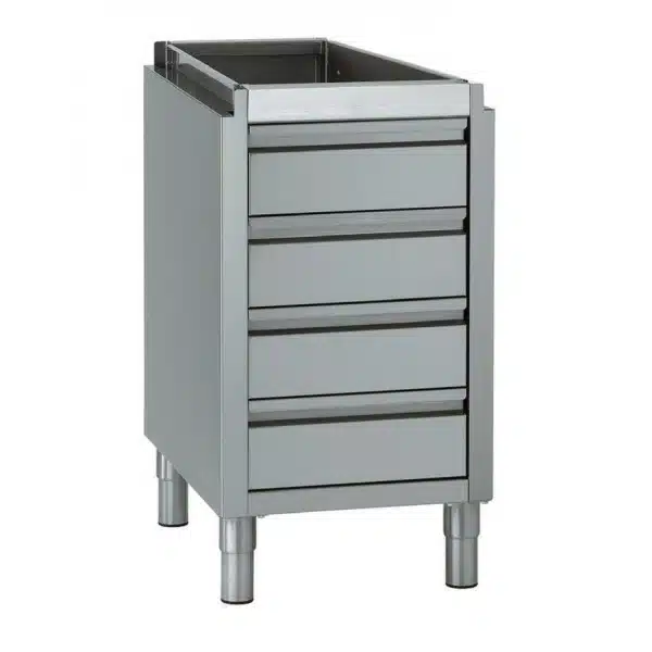 Meuble à 3 tiroirs avec bac GN 1/1 100 mm sans dessus longueur hors-tout 492 mm, inox + 1 tirette