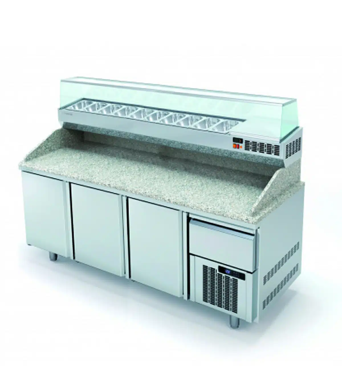 Améliorez l’efficacité de votre cuisine avec notre meuble à pizza 3 portes, équipé d’un tiroir à pâtons et de 3+3 bacs de dimensions 600 x 400 mm. Conçu en acier inoxydable AISI 304, ce meuble offre une robustesse et une durabilité exceptionnelles. Son dessus en granit avec dosseret et joues de 180 mm assure une surface de travail idéale pour la préparation de pizzas.
