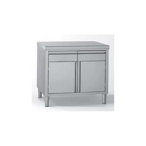 Meuble avec 2 portes coulissantes et 3 tiroirs, idéal pour bien ranger et aménager vos matériels de cuisine.