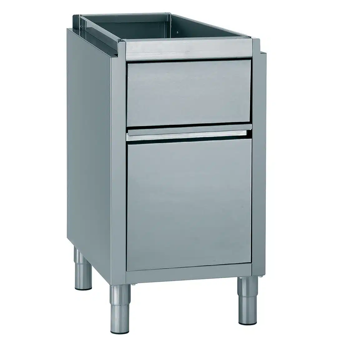 La façade inox du tiroir comporte une poignée à pli écrasé. Volet battant inox en partie supérieure pour l’introduction des déchets. Conception robuste permettant l’évacuation aisée du sac et une parfaite intégration esthétique du meuble dans un ensemble réalisé sur mesure.