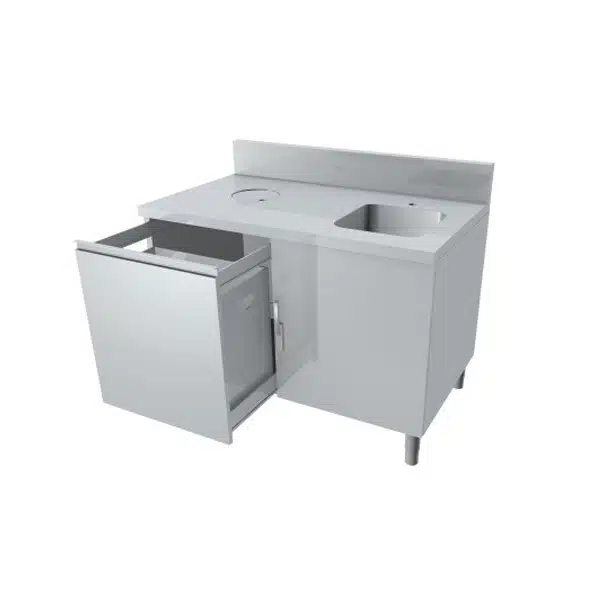 Meuble combiné lave-main/poubelle avec 1 porte battante avec loqueteau, destiné aux professionnels dans le secteur agro-alimentaire.