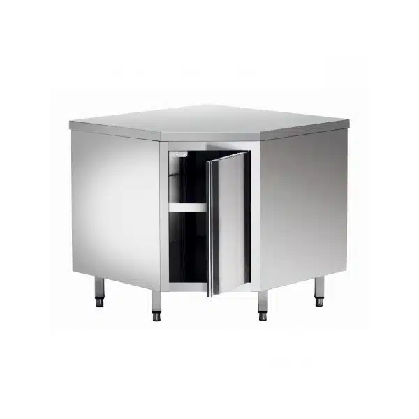 Meuble d’angle 1 porte, acier inox, pour le stockage et le rangement de vos matériels de cuisine.