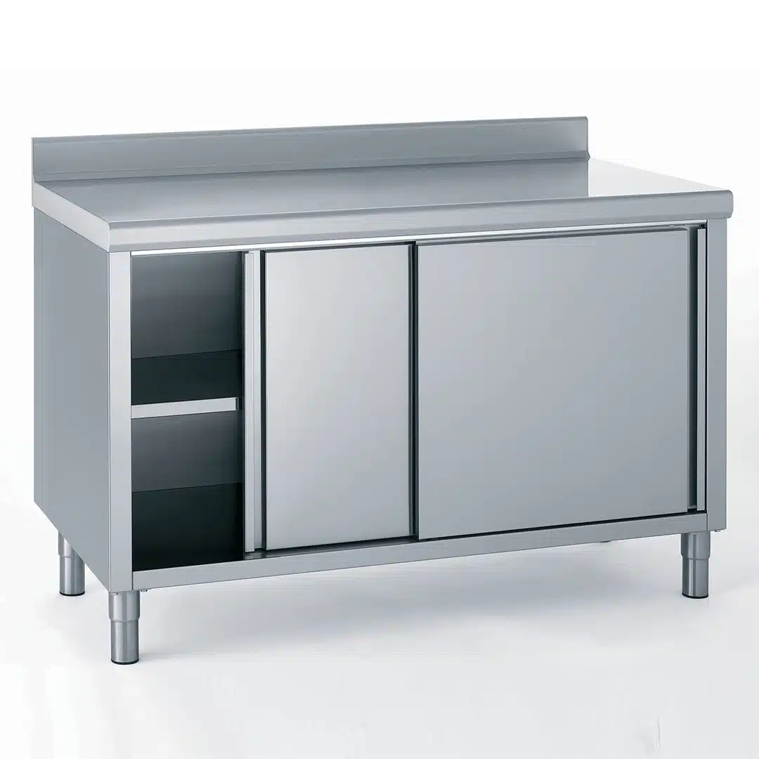 Meuble inox avec dosseret, porte coulissante, idéal pour bien ranger et aménager vos matériels de cuisine.