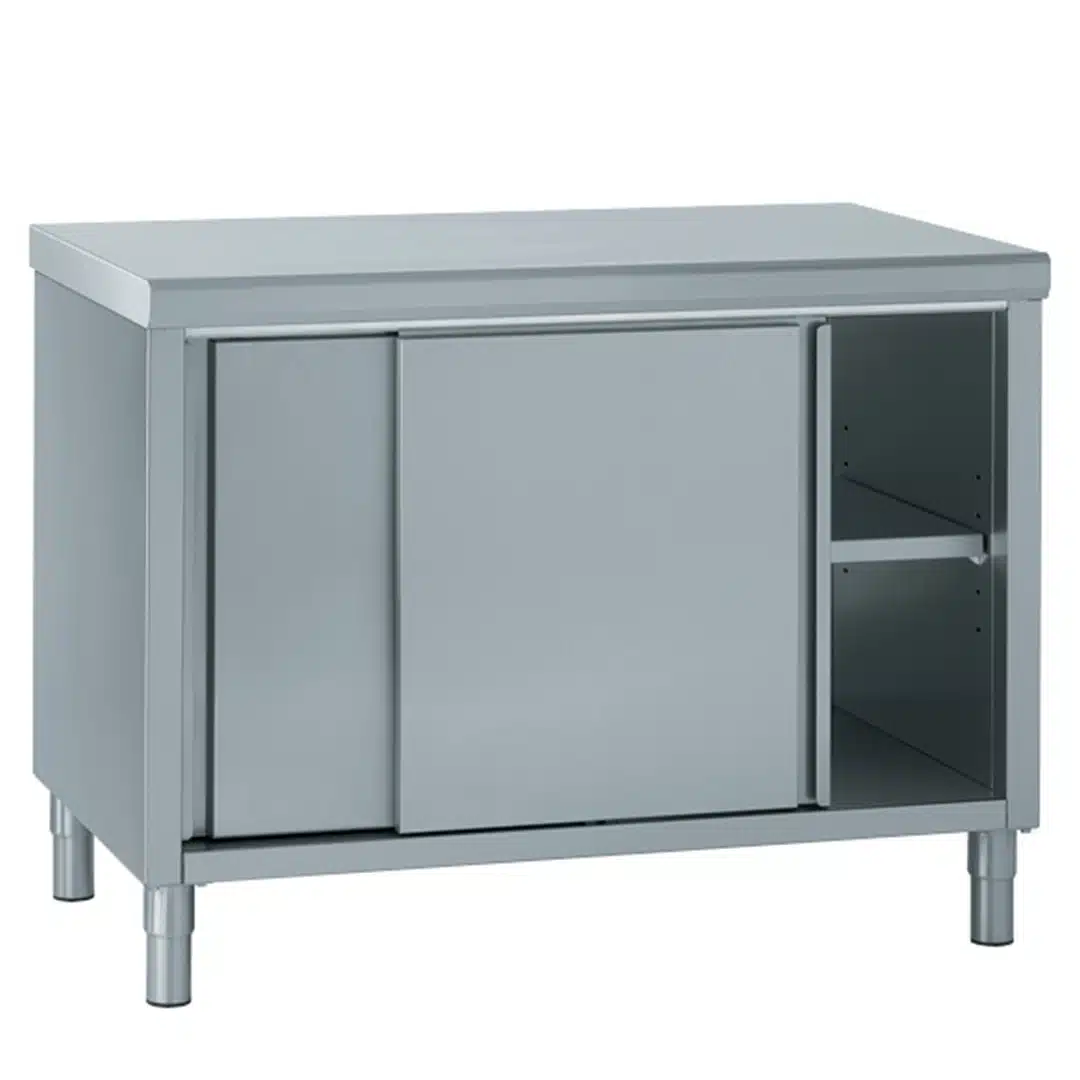 Meuble inox central avec porte coulissante, idéal pour bien ranger et aménager vos matériels de cuisine.