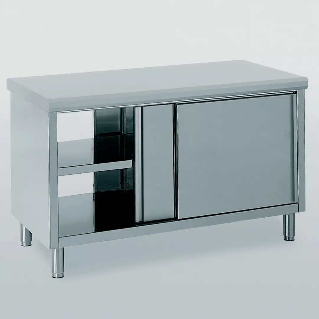 Meuble inox porte coulissante sur 2 faces, idéal pour bien ranger et aménager vos matériels de cuisine.
