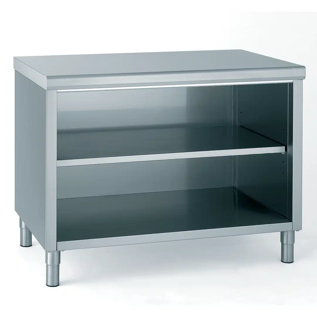 Meuble inox porte ouverte sur 1 face, idéal pour bien ranger et aménager vos matériels de cuisine.