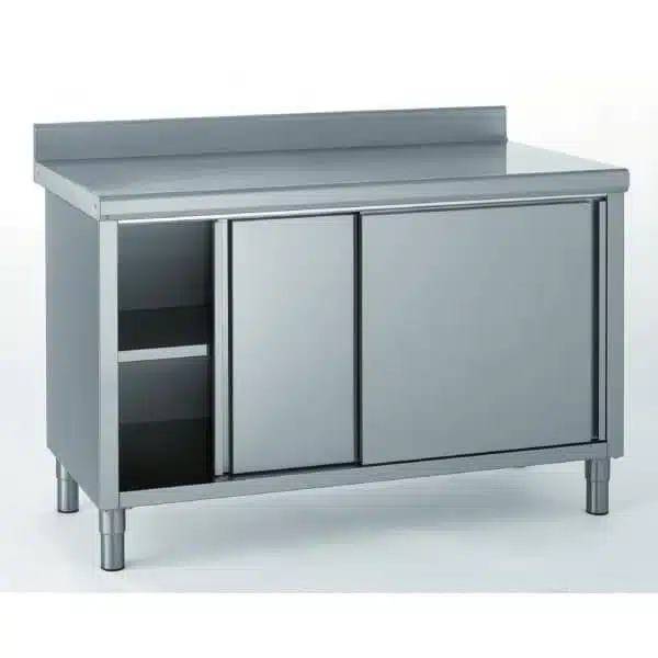 Meuble inox sur-mesure avec dosseret, idéal pour bien ranger et aménager vos matériels de cuisine.