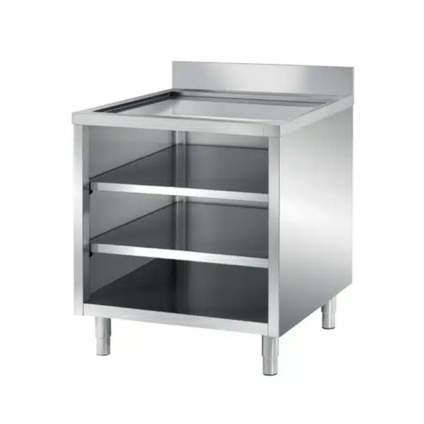 Meuble ouvert, avec dosseret, dessus égouttoir 2 étagères pleines, destiné aux professionnels dans le secteur agro-alimentaire.