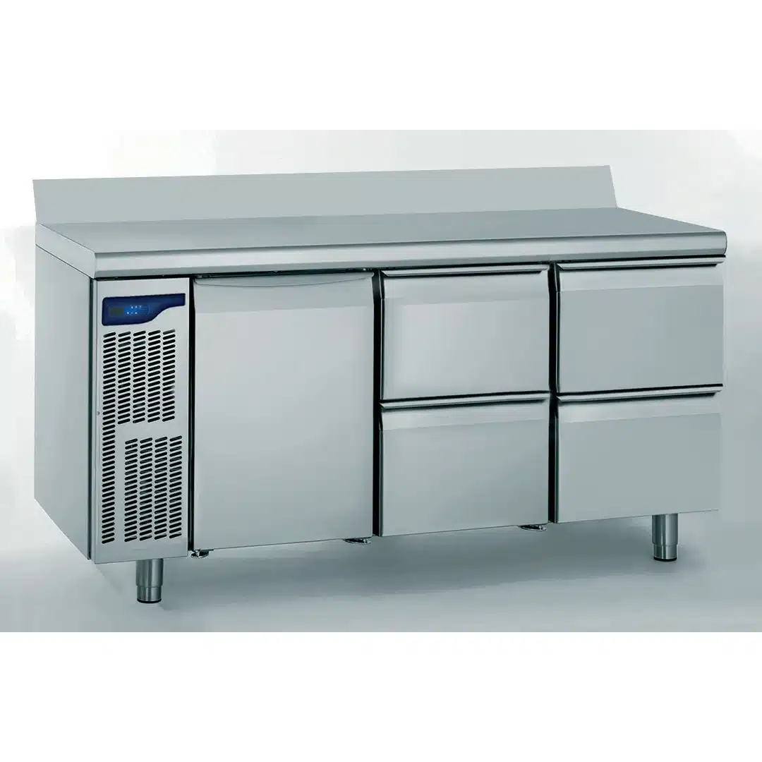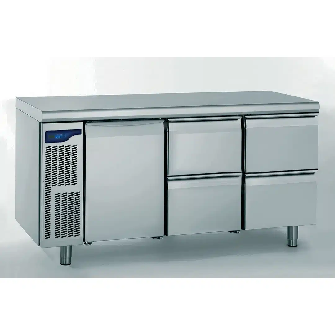 Meuble réfrigéré GN 1/1, 1 portes + 2 x 2 tiroirs, facile à nettoyer grâce à l’intérieur entièrement rayonné, avec des ouvertures uniformément réparties dans le plafond qui garantissent une répartition homogène de la température à l’intérieur de la réserve.