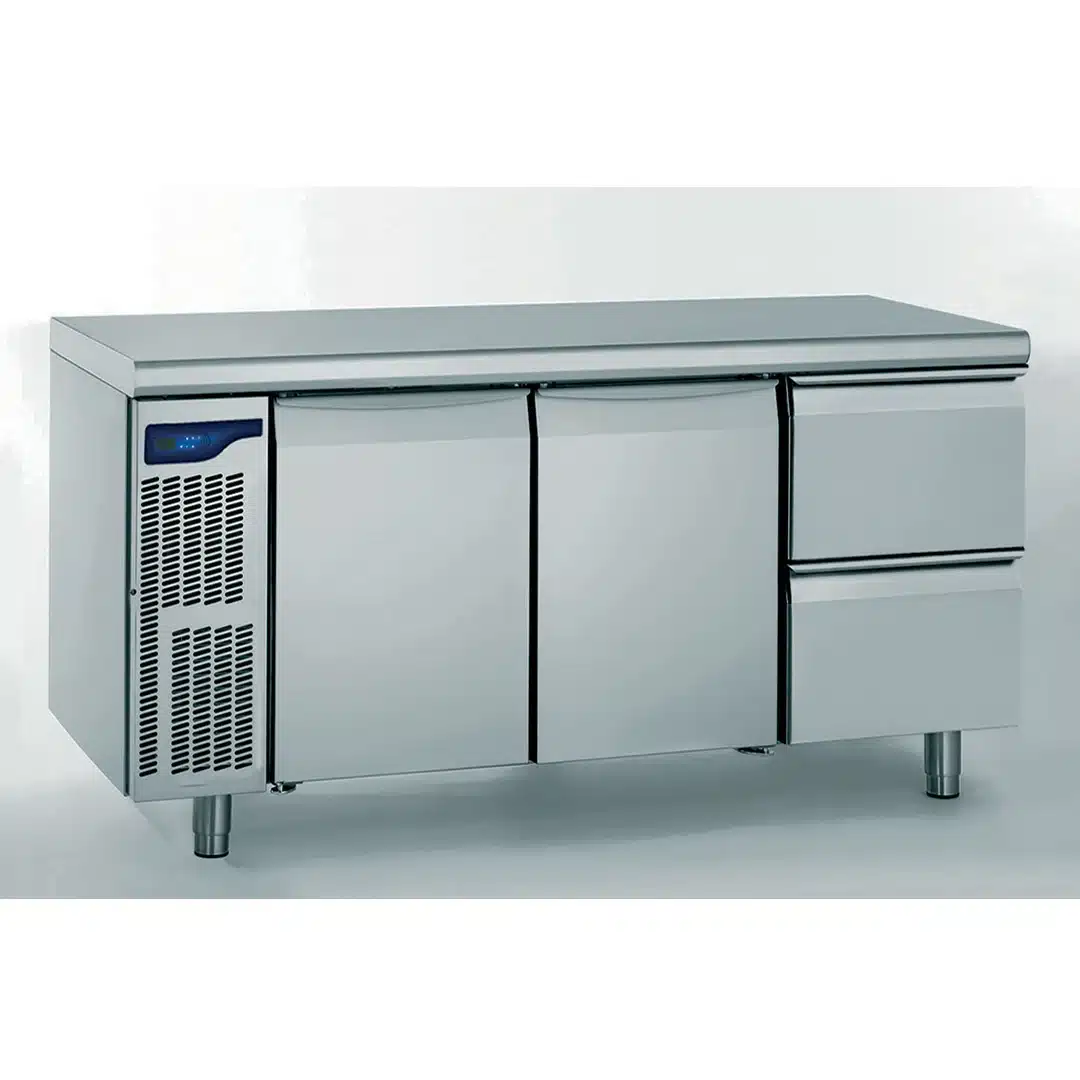 Meuble réfrigéré GN 1/1, 2 portes + 2 tiroirs, facile à nettoyer grâce à l’intérieur entièrement rayonné, avec des ouvertures uniformément réparties dans le plafond qui garantissent une répartition homogène de la température à l’intérieur de la réserve.
