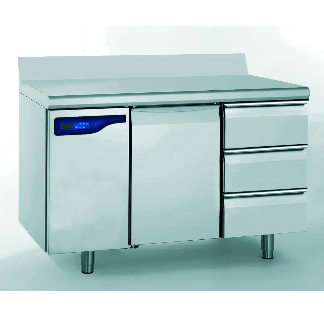 Meuble réfrigéré GN 1/1, 1 porte + 3 tiroirs, facile à nettoyer grâce à l’intérieur entièrement rayonné, avec des ouvertures uniformément réparties dans le plafond qui garantissent une répartition homogène de la température à l’intérieur de la réserve.