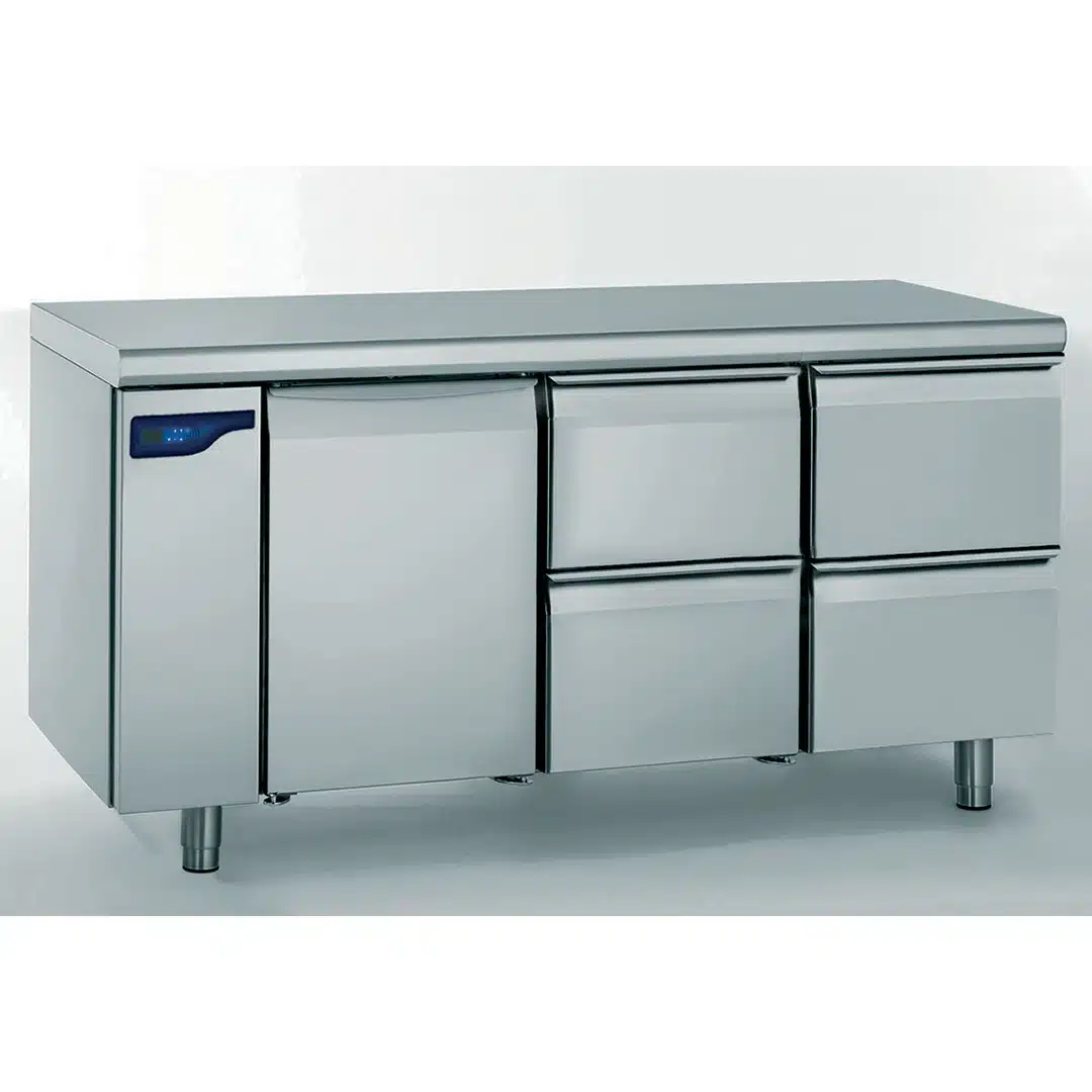 Meuble réfrigéré GN 1/1, 1 portes + 2 x 2 tiroirs, facile à nettoyer grâce à l’intérieur entièrement rayonné, avec des ouvertures uniformément réparties dans le plafond qui garantissent une répartition homogène de la température à l’intérieur de la réserve.