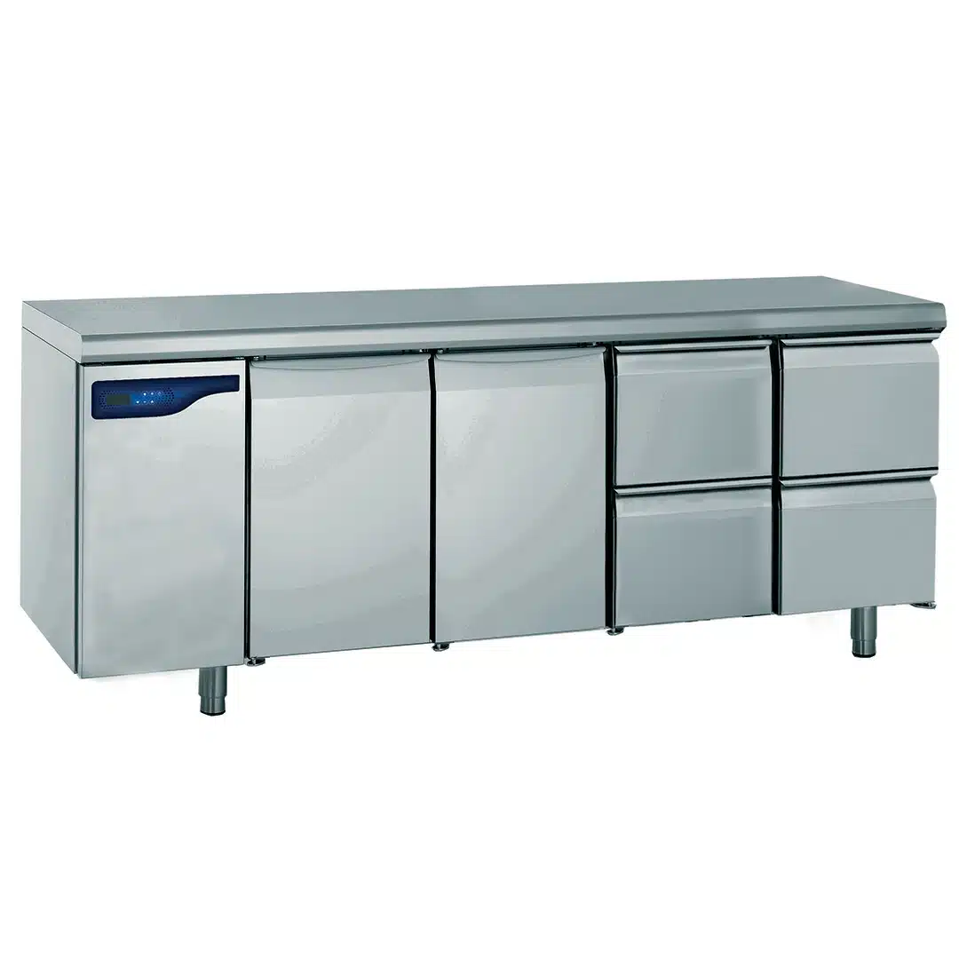 Meuble réfrigéré GN 1/1, 2 portes + 2 x 2 tiroirs, facile à nettoyer grâce à l’intérieur entièrement rayonné, avec des ouvertures uniformément réparties dans le plafond qui garantissent une répartition homogène de la température à l’intérieur de la réserve.
