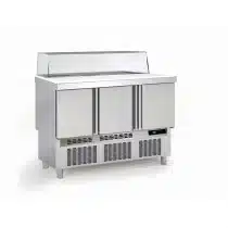 Meuble saladette avec plaque de travail polyéthylène, dessus inox, pour le stockage et l’exposition de tous les types de produits alimentaires pour les restaurateurs.
