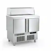 Meuble saladette avec plaque de travail polyéthylène, dessus inox, pour le stockage et l’exposition de tous les types de produits alimentaires pour les restaurateurs.
