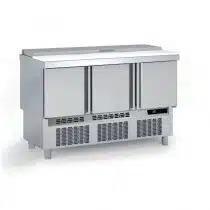 Meuble saladette avec plaque de travail polyéthylène, dessus inox , 3 portes pleines, 264 L
