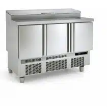 Meuble saladette, dessus inox avec couvercle, 3 portes pleines, 264 L
