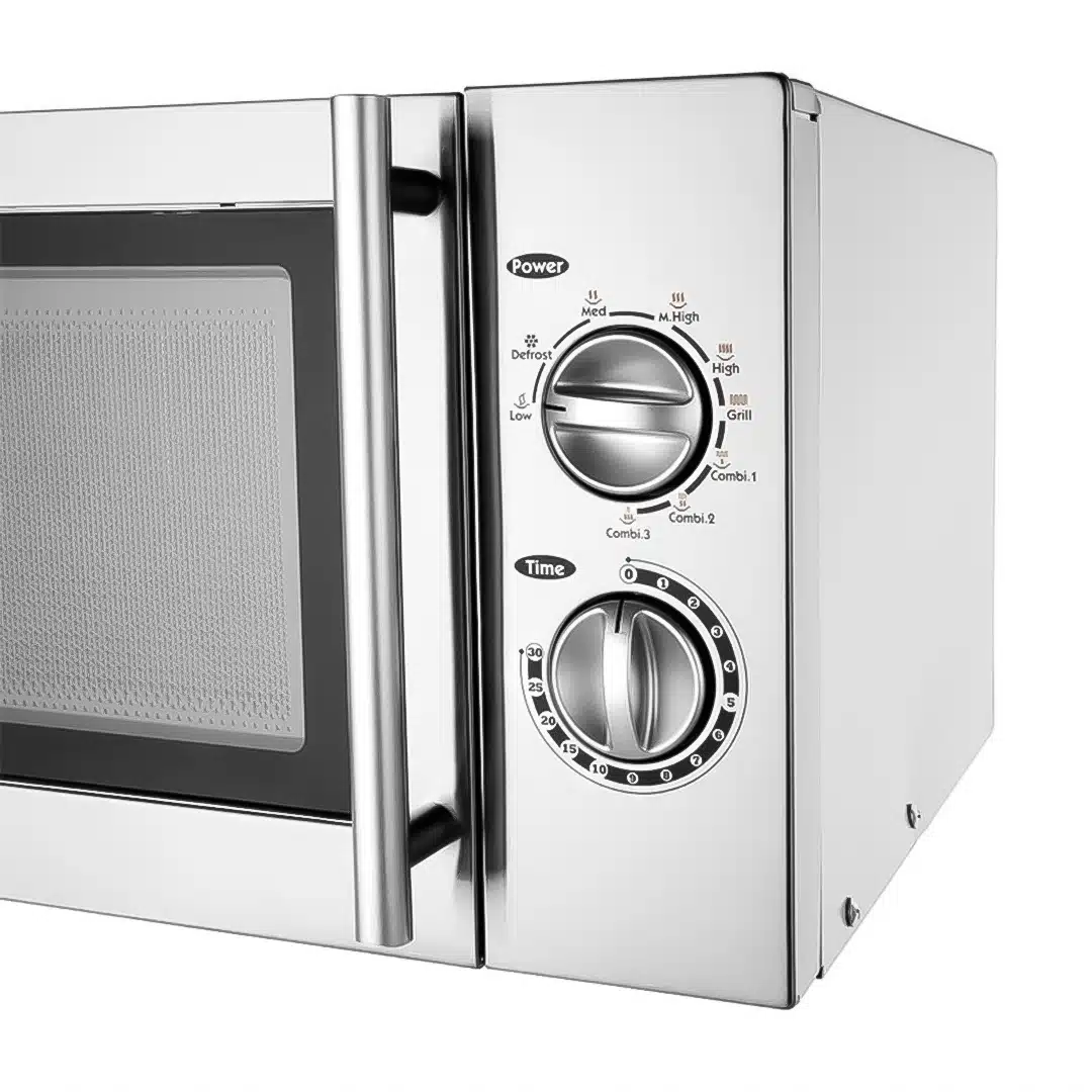 Micro-ondes grill manuel, avec fonction gril et combinée, vous permettant de dorer des plats pour éviter l’utilisation d’un four traditionnel.