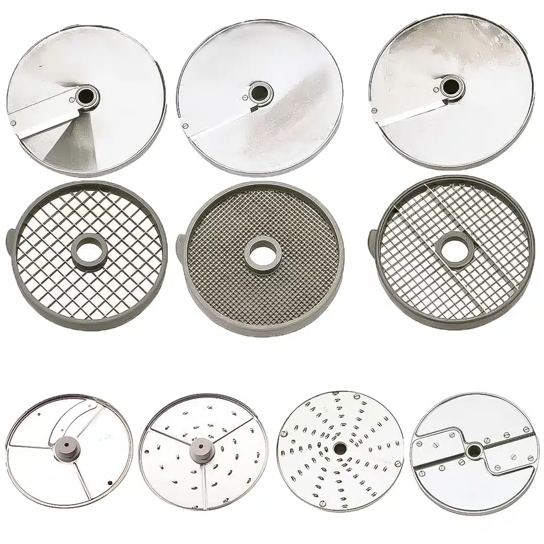 Eminceur 0,8mm – éminceur 2mm – éminceur 5mm – râpeur 2mm – râpeur 5mm – bâtonnet 2,5×2,5mm – bâtonnet tagliatelle 2x10mm – brunoise 5x5x5mm – macédoine 14x14x5mm – Macédoine 10x10x10mm,