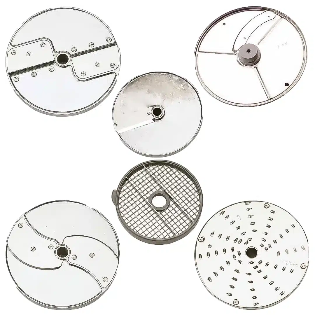 - Disques pour modèles R502-R502V.V.-R652-R652V.V.-CL50-CL52-CL55-CL60 : éminceur 1 mm – éminceur 3 mm – rapeur 2 mm – Julienne 4 x 4 mm – Macédoine : 10 x 10 x 10 mm