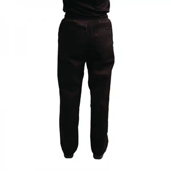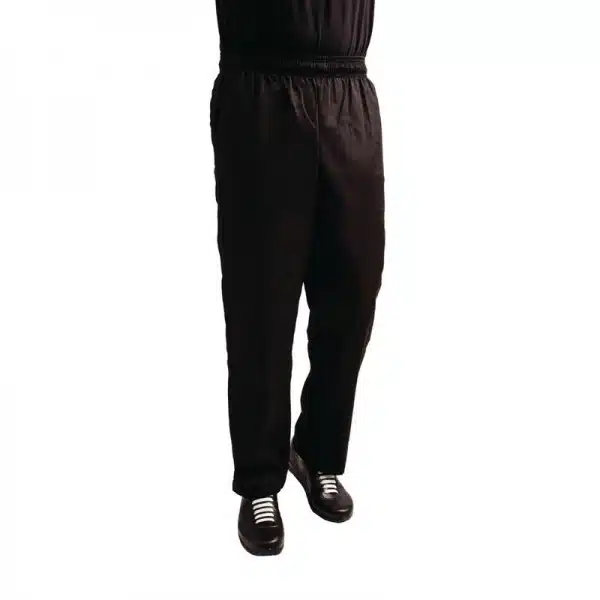 Pantalon de cuisine mixte noir, facile à nettoyer car il ne possède pas de bouton susceptible de se casser, parfait pour se protéger contre les éclaboussures ou déversements qui glisseront sur la surface.