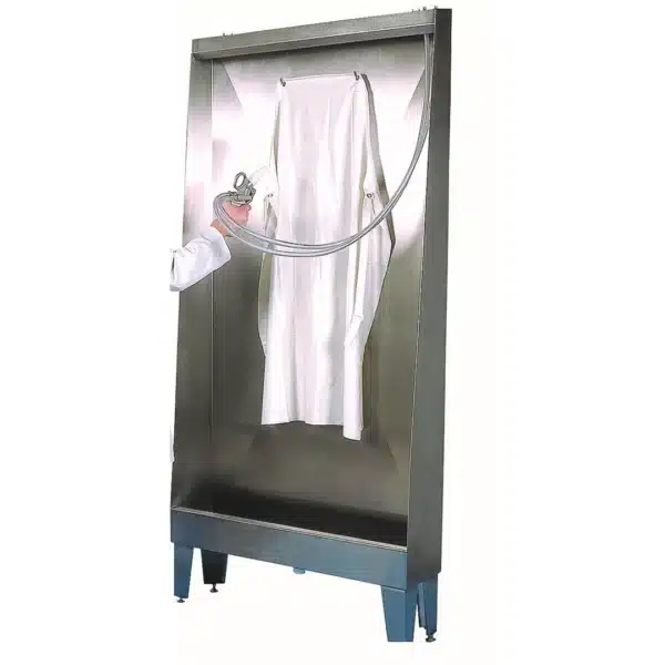 Paroi permettant d’accrocher les tabliers afin de les laver à l’aide d’un pistolet air-eau « TURBO-CLEANER » projetant une eau surpressée à 10 bars, sans aucune éclaboussure.