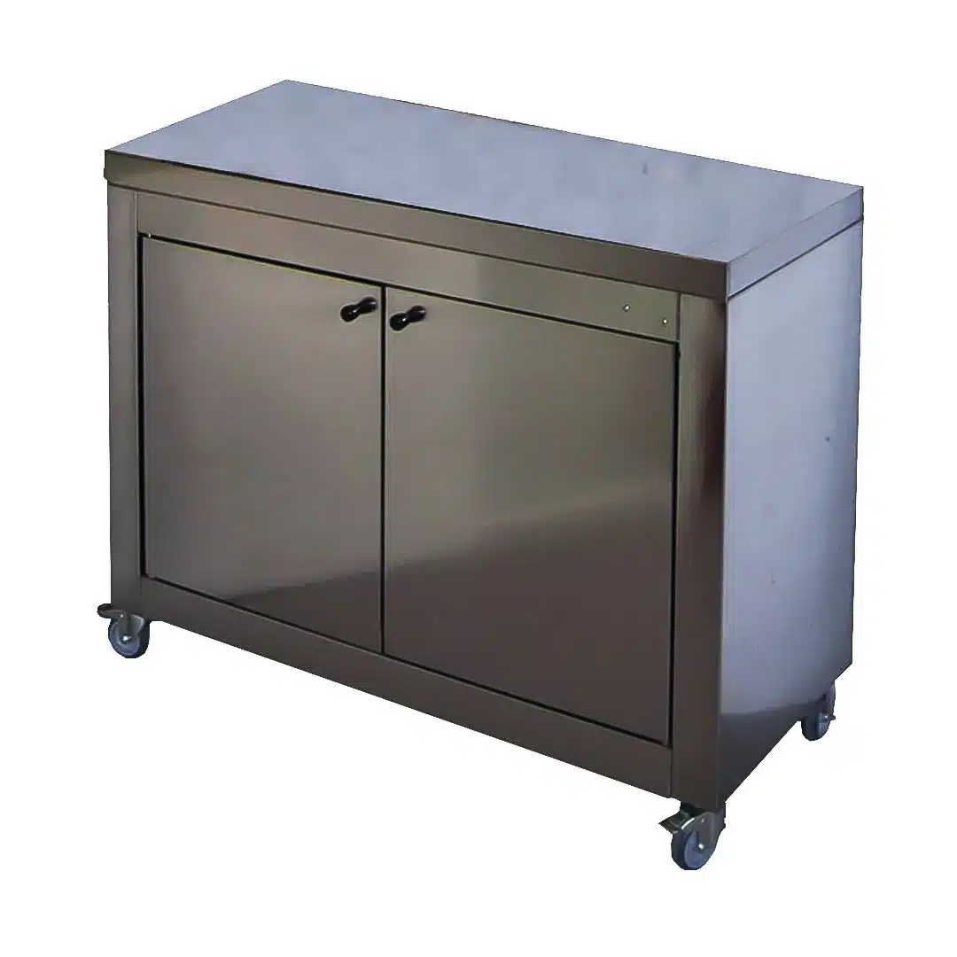 Le placard à 2 portes avec fond et étagère sur roulettes est l’accessoire idéal pour les rôtissoires MAP 2, 3 et 4. Il offre un espace de rangement optimisé pour vos ustensiles et ingrédients.