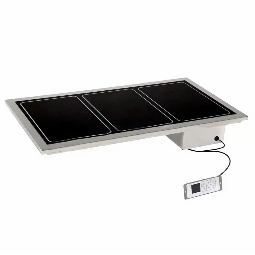 Plan chauffant en verre trempé DROP-IN 3 x GN1/1 avec panneau de commande à distance, conçu pour les buffets et tout type de système de distribution.