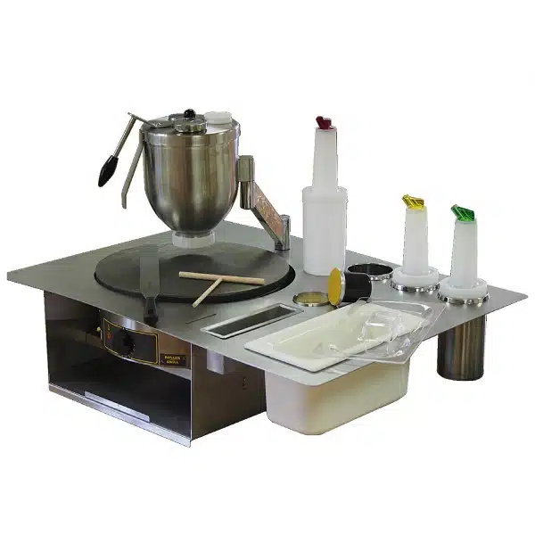 Tous les éléments de la crêperie professionnelle réunis dans un plan de travail.