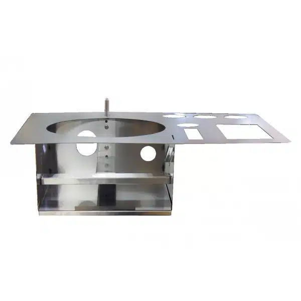 Les emplacements de tous les équipements sont déjà découpés dans l’INOX. Le châssis est prévu pour être encastré sur un plan de travail, Food truck ou chariot à crêpes.