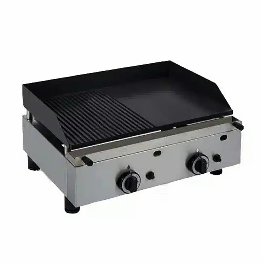 Plaque à snacker à gaz, lisse et rainurée céramique, avec bac collecteur de jus en façade, pratique pour une cuisson parfaite et précise de vos aliments.