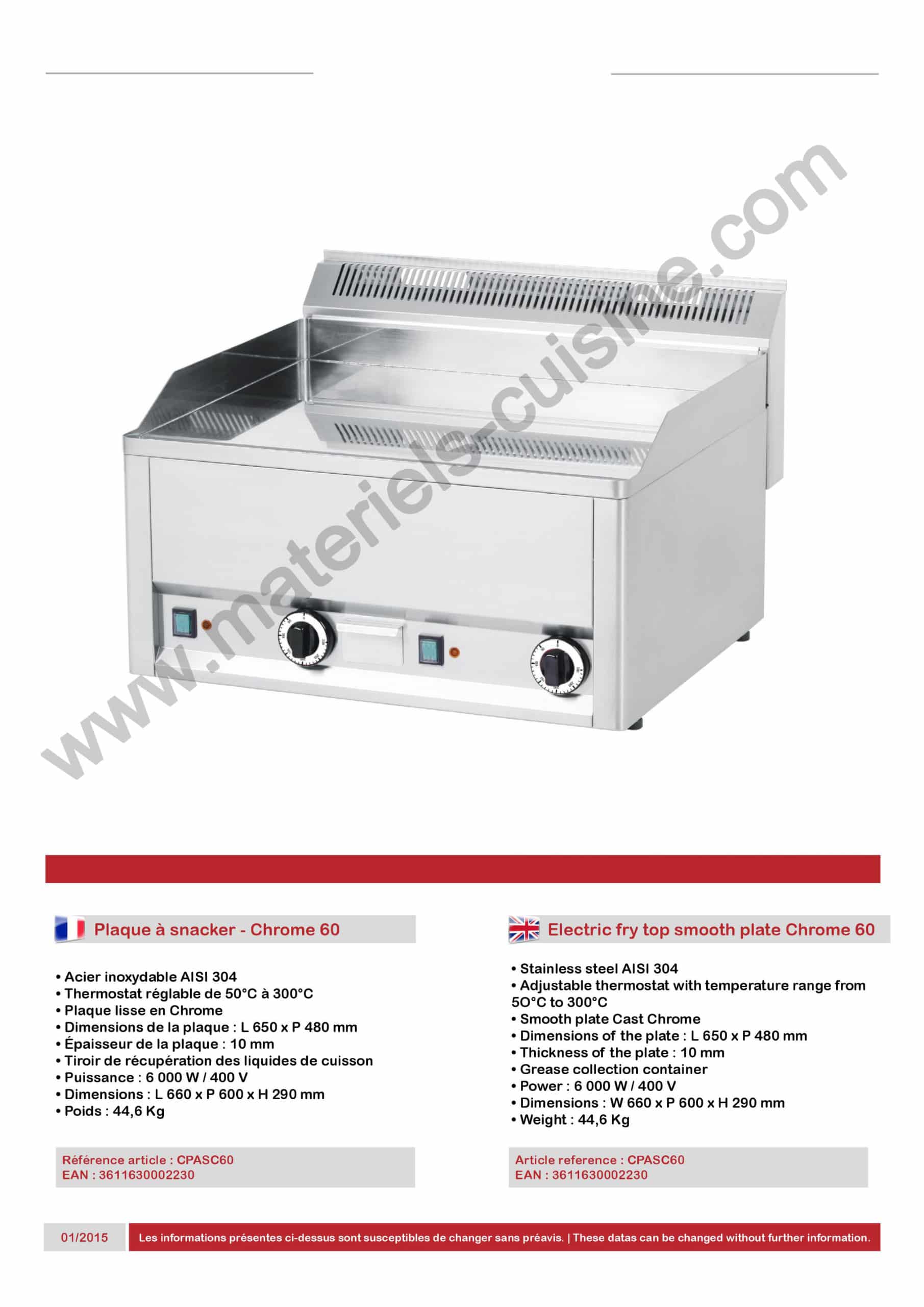 Plaque à snacker Chrome 60 en acier inoxydable AISI 304 6000 W