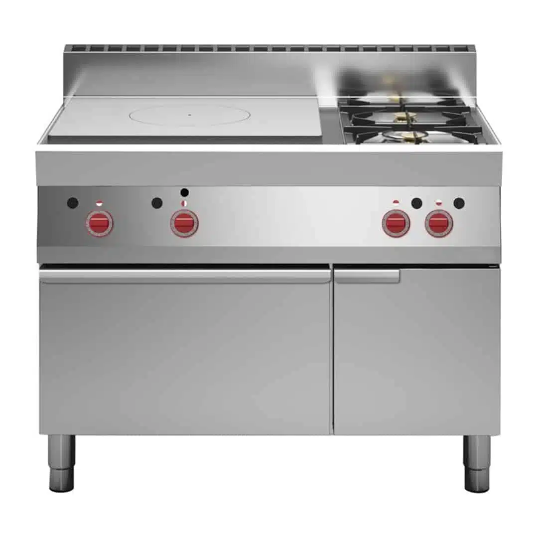Plaque coup de feu à gaz avec 2 feux vifs sur four et placard fermé, conçu pour les cuisines professionnelles exigeantes, offrant une solution complète alliant puissance, polyvalence et durabilité.
