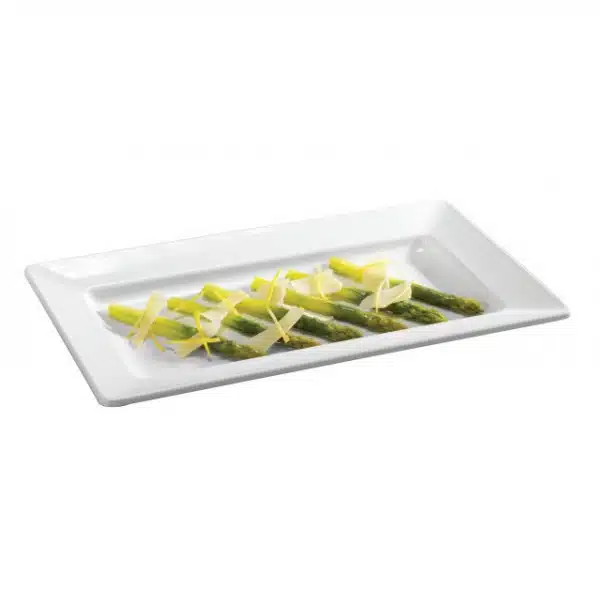 Plat blanc en mélamine, bords larges, ustensile de cuisine pas cher, parfaite pour vos services et la présentation de vos aliments.